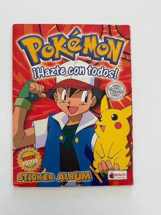 Álbum de cromos de Pokémon, edición ¡Hazte con todos!. Incluye un póster de regalo. - Portada con Ash y Pikachu. - Logo de Nintendo. - Título Sticker Album. -Album completo