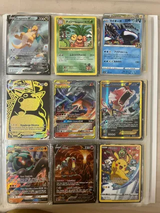 Colección de cartas Pokémon de diferentes tipos y raridades, diferentes. Incluye el álbum - Incluye cartas como Dragonite V, Exeggutor, Pawmot, Kyogre, Pikachu VMAX, Reshiram & Charizard GX, Gyarados, Marshadow GX, Entei V y Pikachu. - Algunas cartas son raras y especiales, con arte alternativo y foil. Puedo pasar más fotos, ya que hay más cartas pero son básicas algunas con brillo. + 5 cartas grandes de 18cm reales paso foto si interesa