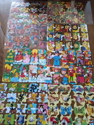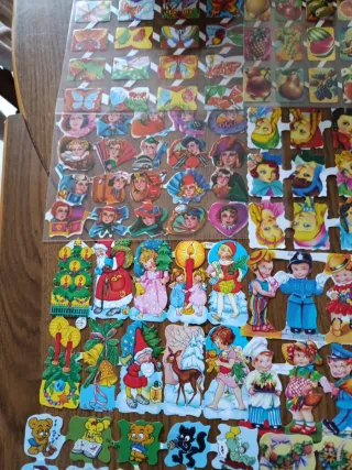 Conjunto de cromos troquelados con diseños variados. - Figuras de personajes, animales y flores. - Ideal para coleccionistas y manualidades.