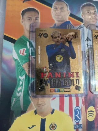 Colección de cromos de fútbol Balón de Oro. - Incluye cromos de jugadores como Lamine Yamal y Mbappé. - Cromos con detalles dorados y estadísticas de jugadores, Escucho ofertas.