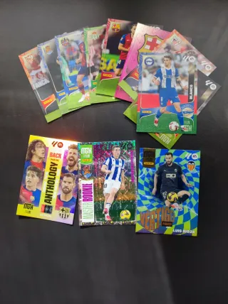 Lote variado de 96 cromos y cartas de fútbol de diferentes colecciones, incluyendo Panini. - Incluye repetidos - Cartas con diseños como 'Anthology', 'Master Rookie' y 'Vertigo Power'. - Incluye cartas con el escudo del FC Barcelona y otros equipos.