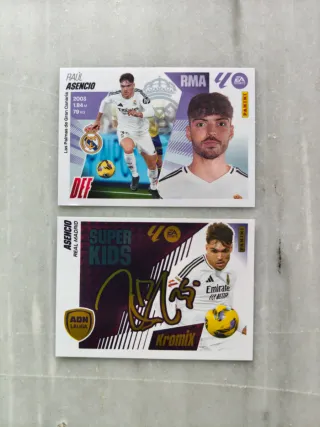 Colección de cromos de Raúl Asencio del Real Madrid. - Incluye dos cromos. - Uno de ellos es de la colección Super Kids. - Ambos son de la marca Panini. - Uno de los cromos está firmado.