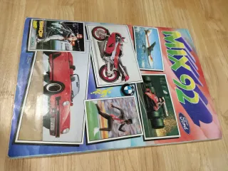Álbum de cromos MIX 92. - En excelente estado. - Faltan 10 cromos solo. - Portada con imágenes de coches, motos, aviones y deportistas. - Incluye el logo de Ford.