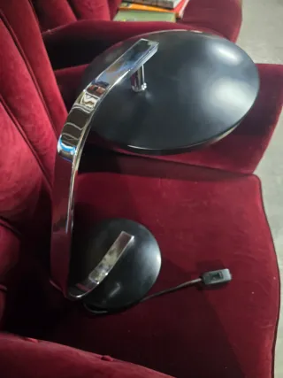 Lámpara de diseño Fase no tiene ni bollos ni arañazos .con acabado en cromo y base negra. Le falta el cristal - Brazo curvo y flexible. - Pantalla redonda. - Interruptor en el cable.
