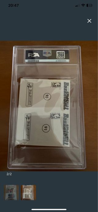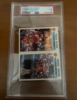 Panel de cromo de Panini de 1990 con Michael Jordan y Scottie Pippen. Certificado por PSA. - Panel de cromo de Panini de 1990. - Incluye a Michael Jordan y Scottie Pippen. - Panel cortado a mano. - Grado EX 5.