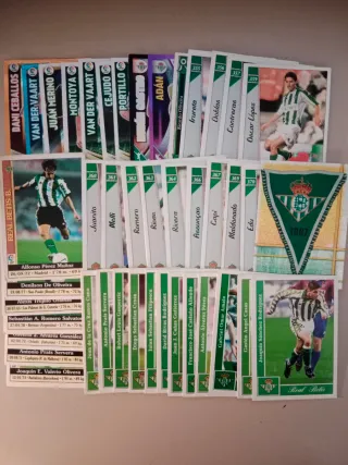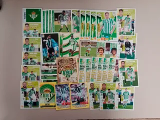 -Lote de 100 cromos de jugadores del Real Betis Balompié. -Cromos nunca pegados. -La mayoría en perfectas condiciones,aunque alguno algo más deteriorado. -Ninguno repetido(salvo que se me escapara alguno ).