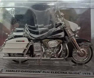 Réplica detallada de la icónica motocicleta Harley-Davidson FLH Electra Glide de 1970. - Diseño clásico en blanco y negro. - Detalles cromados. - Base expositora incluida.
