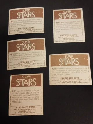 Conjunto de 5 cromos de la colección Super Stars. - Incluye imágenes de diferentes artistas. - Ideal para coleccionistas. - más 5 figuras muñecos Playmobil