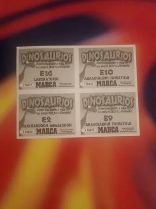 Colección de cromos de dinosaurios. - Imágenes de diferentes especies de dinosaurios. - Incluye un cromo de un dinosaurio de cuello largo. - Muestra una mandíbula de dinosaurio con niños dentro. - Detalla el montaje de un esqueleto de dinosaurio.