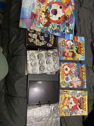 Lote de artículos de Yo-kai Watch que incluye un póster, un álbum de pegatinas y varios paquetes de cromos. - Póster grande con personajes de Yo-kai Watch. - Álbum de pegatinas. - Varios paquetes de cromos de Yo-kai Watch.