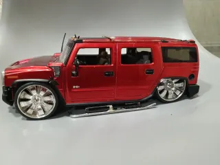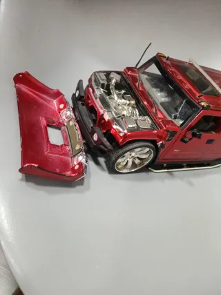 Réplica detallada del Hummer a escala 1/18 accidentado,mal estado,eje trasero roto,piezas faltantes,precio 4€ - Color rojo metálico. - Diseño de SUV. - Ruedas cromadas. Jada,solido,burago