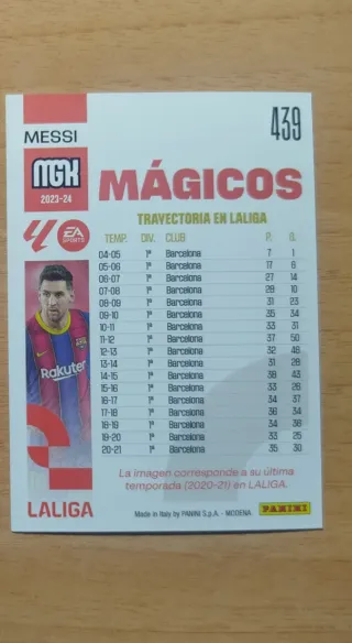 Colecciona este cromo de Lionel Messi de la colección Mágicos de LaLiga. - Cromo de la temporada 2023-24. - Incluye la imagen de Messi con la equipación del FC Barcelona. - Diseño brillante y llamativo.