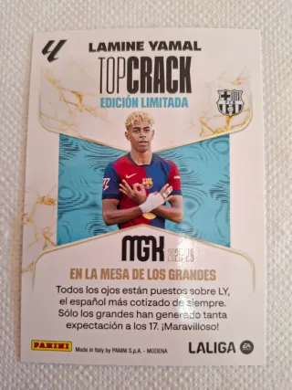 Cromo de colección de Lamine Yamal de la edición Megacrack. - Edición limitada. - Temporada 2025/26. - Incluye escudo del FC Barcelona y logo de EA Sports.