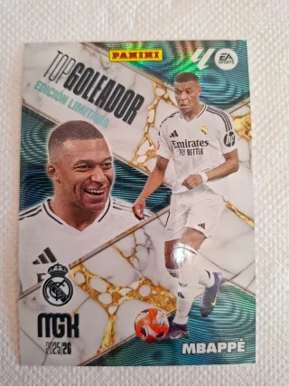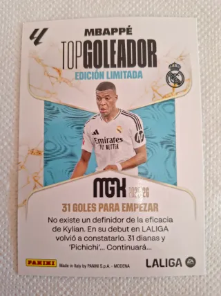 Cromo de Kylian Mbappé de la colección Megacrack 2025/26. - Edición limitada. - Diseño Top Goleador. - Incluye escudo del Real Madrid.