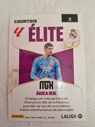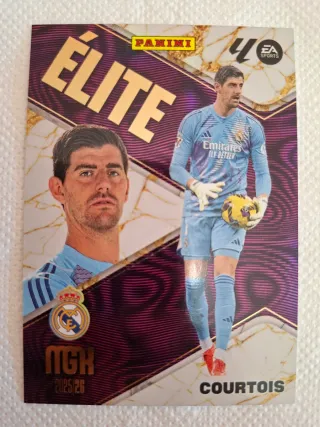 Colecciona este cromo de la colección Panini Élite de la temporada 2025/26. - Cromo de Thibaut Courtois. - Diseño Élite de Panini. - Incluye escudo del Real Madrid.