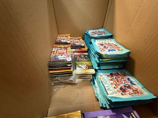 Lote variado de cromos de fútbol y otros artículos de colección. - Incluye cromos de fútbol de diferentes equipos y jugadores. - También se aprecian otros tipos de cromos y coleccionables. - Se incluye una lata metálica con diseño vintage.