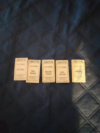 Lote de 5 cromos de la Liga 77/78 del RCD Español. - Cromo de De Felipe. - Cromo de Ortiz Aquino. - Cromo de Manolín Cuesta. - Cromo de José Manuel. - Cromo de Serna.