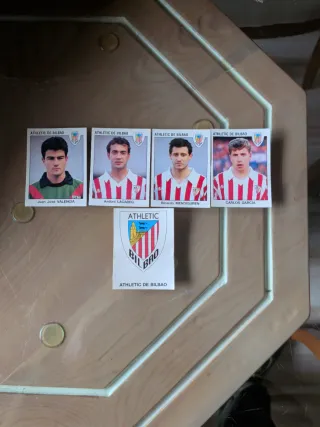 Conjunto de 5 cromos de jugadores del Athletic de Bilbao de la temporada 93-94. - Cromos de Juan José Valencia, Andoni Lacáreo, Ricardo Mendiguren y Carlos García. - Incluye escudo del Athletic de Bilbao.