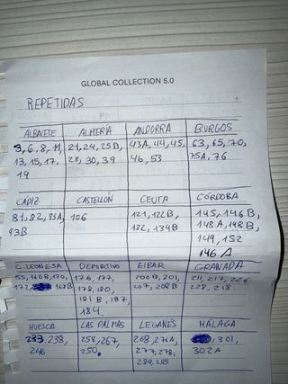 Pregunta sin compromiso por los cromos que te faltan, tengo varias repartidas, cada cromo a 0'20€ Tengo repetidas: 1-2-3-4-6-7-8-10-11-12-14-16-18-25-27-28-30-33-35-37-39-40-42-43-45-46-51-53-56-58-63-66-67-68-69-71-72-75-79-80-81-82-85-88-89-91-93-94-95-96-97-100-104-108-109-110-111-112-113-114-115-118-119-124-126-127-130-132-133-138-139-142-149-156-158-164-166-169-171-172-174-175-176-179-180-181-184-185-188-193-194-196-198-199-200-203-205-207-211-212-213-216-217-219-222-224