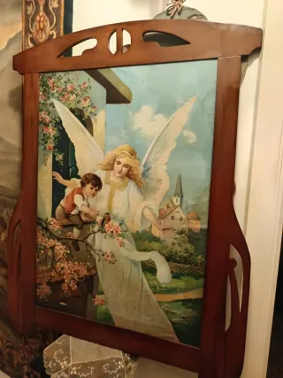 Gran cromo litografía de principios del siglo XX, con una escena de un ángel protegiendo a un niño. - Marco de madera tallada. Época modernista en perfecto estado de conservación.Mide 90/60 cm.Una pieza auténtica.