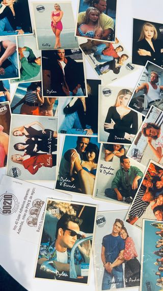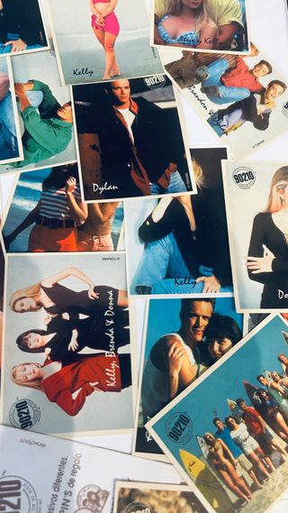 Colección de 23 cromos de la serie Sensación de Vivir (Beverly Hills, 90210). Coleccion de los donuts de los años 90 - Incluye personajes como Kelly, Dylan, Brenda, Donna, Steve y Brandon. - Cada cromo tiene el logo de 90210 y el nombre del personaje o personajes. - Algunos cromos muestran escenas grupales y otros individuales.