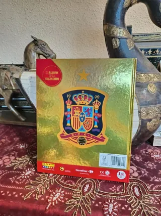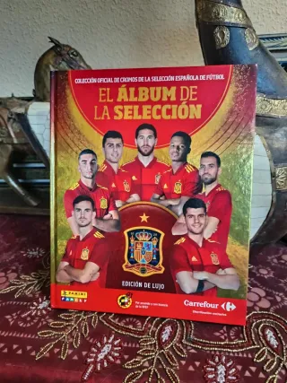 Álbum oficial de cromos de la Selección Española de Fútbol completo. Se regala otro álbum con 28 cromos. Mueble tallado blanco