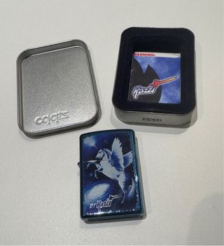Este Zippo Mazzi presenta un diseño cósmico con un pegaso alado. Fantasy Unicorn Blue Sapphire - Acabado azul metálico cromado brillante. - Firma BY Mazzi en la parte inferior.