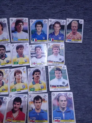Colección de 77 cromos del Mundial de Italia 90.ULTIMO PRECIO - Incluye jugadores como Scifo, Valdano, Maradona, Roberto Donadoni, Careca, Valdo, Aldair, Gary Lineker, Vaccadei, Bebeto, Dunga, Ricardo Rocha, Miguel González, Michel y Juan Rodríguez. - Cromos de diferentes selecciones nacionales.