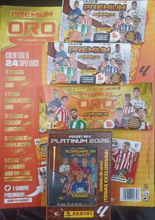 Colección de cromos Panini Adrenalyn XL LaLiga Premium Oro de la temporada 2025-26. Incluye varios sobres y una caja. - 2 Sobres Premium Adrenalyn XL. - Contiene caja pocket box - 1 sobre Premium oro. Posibilidad de que toque firma.