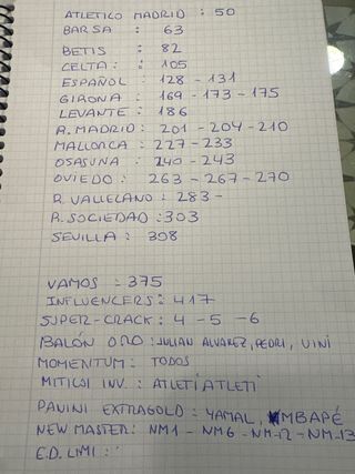 Colección oficial de cromos de la LALIGA EA SPORTS temporada 2025-26. - Incluye la colección completa de cromos SIN PEGAR - Producto oficial de LALIGA y Panini. - ÁLBUM vacío - 20 equipos completos, incluido el cromo de LUKA LLIC del Oviedo con escudo y sin escudo. - Los 89 cromos de últimos fichajes. - 13 cromos MISTER CERO. - Cromo Mister Cero 4Bis - Los 3 Iconos de Mister Cero. - 15 cromos SUPER KIDS. - 15 cromos KROMIX SUPER KIDS con firmas. - 23 cromos MIX - 10 Extra GOLD - 3 Supreme EXTRA GOLD - Supreme 10 Extra Gold MBAPPE - Supreme 10 Extra Gold LAMINE YAMAL