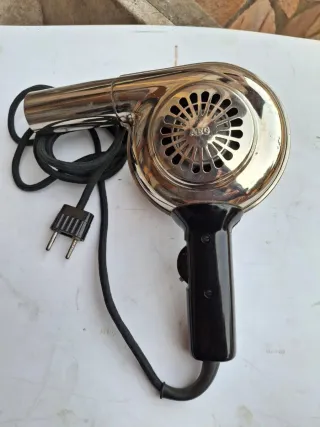 Secador de pelo vintage con un acabado cromado brillante y detalles en negro . Mide veintitrés de alto y veintiséis de largo. Pesa un kilo Años sesenta setenta - Diseño retro. - Rejilla frontal con logo AEG. - Mango ergonómico negro. - Cable de tela con enchufe.