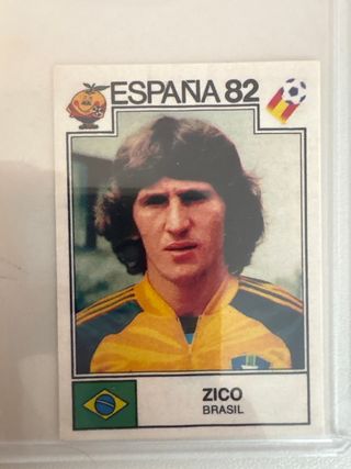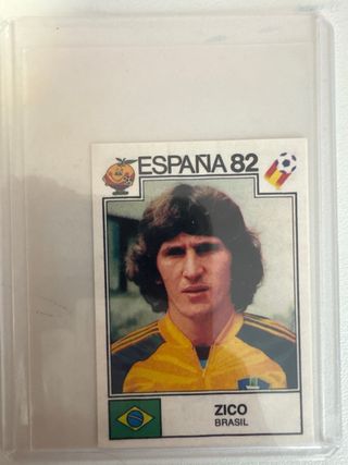 Cromo del futbolista Zico, correspondiente al Mundial de España 82. - Ilustración de Zico con la camiseta de Brasil. - Diseño con el logo del Mundial 82 y la bandera de España. - Incluye la bandera de Brasil y el nombre del jugador.