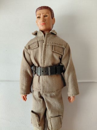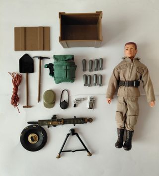 Madelman de 1a generación. Ref. 107 Traje de tela de color marrón medio. Gorra militar de color marrón medio. Accesorios: - Cinturón militar tipo "web belt" y botas en color marrón - Mochila de tela verde con manta de tipo lana color gris - Pico y pala - Cuerda - Cantimplora - Pistola de señales cromada - Radiotransmisor cromado - Mortero desmontable (tubo, base y bípode) - Caja de munición tipo "madera" con tapa y 8 proyectiles para mortero Buen estado Preferiblemente venta en persona.