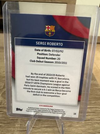 Cromo de Sergi Roberto, jugador del FC Barcelona. Está en perfecto estado y se encuentra en una funda protectora. - Número de serie: 174/250 - Jugador: Sergi Roberto - Equipo: FC Barcelona - Posición: Defensa