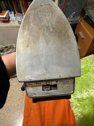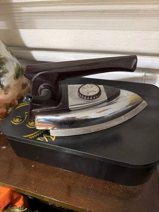 Plancha vintage con un diseño clásico y elegante. - Cuerpo principal de baquelita en color marrón oscuro. - Base de planchado de cromo pulido. - Selector de temperatura con dial. - Asa ergonómica para un agarre cómodo.