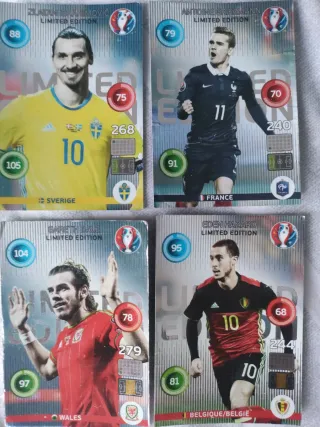 Colección de cromos de fútbol de edición limitada. - Cromos de jugadores como Zlatan Ibrahimović, Antoine Griezmann, Gareth Bale y Eden Hazard. - Incluye números de serie y estadísticas de los jugadores.