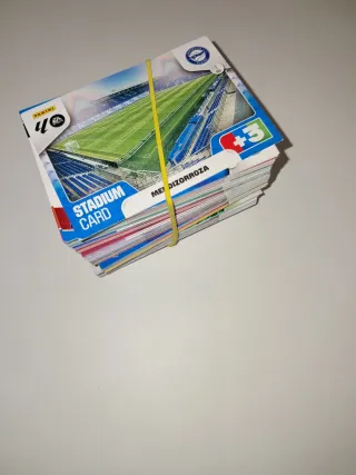 Colección de cromos de fútbol Adrenalyn XL de la temporada 2025/2026. Incluye varios estadios y cartas. - Cromos de la colección Adrenalyn XL. - Cartas de estadios de fútbol. - Incluye diferentes equipos y jugadores.