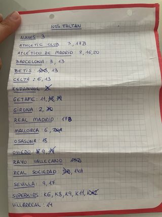 Colección de cromos de la Liga Este. Repetidos: ALA: 7 - 12 - 14 ATH: 19 ATM: 3 - 8 - 17 FCB: 10A - 12 - 16 BET: 19 CEL: 5 - 7B - 10B ELC: 5 - 11 ESP: 1 - 12 - 16 GET: 9A - 16 GIR: 4B - 19 LEV: 1 - 12 RMA: 5 MLL: 9 - 11 OSA: 15 - 19 RAY: 4 - 10 - 13 SEV: 9 VAL: 5A VIL: 3 - 16 - 17 - 20 MIX: 11 - 17 CERO: 10