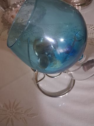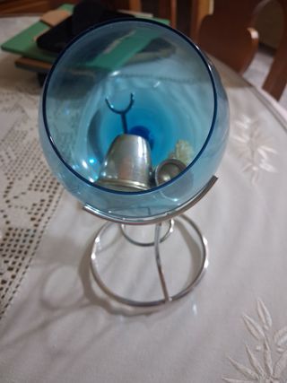 Preciosa copa calienta licores de cristal azul, con base metálica. Ideal para disfrutar de tus bebidas favoritas. - Copa de cristal azul translúcido. - Base de metal cromada. - Diseño elegante y vintage. - Perfecta para regalo.