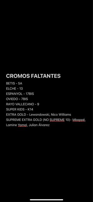 Colección de cromos de Adrenalyn 2026 para intercambio o venta. En la primera fotos mis repetidos y en la segunda mis faltas. Ideal para completar tu álbum. - Cromos de diferentes equipos de fútbol. - Incluye cartas especiales y repetidas.