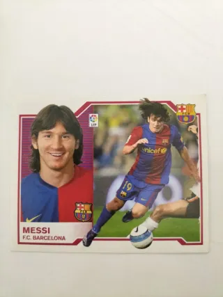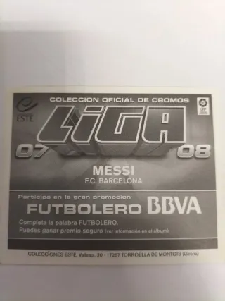 Cromo de fútbol de Lionel Messi jugando para el F.C. Barcelona. Totalmente nuevo. Liga 2007- 08. - Incluye el escudo del F.C. Barcelona. - Lleva el logo de LFP.