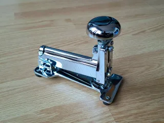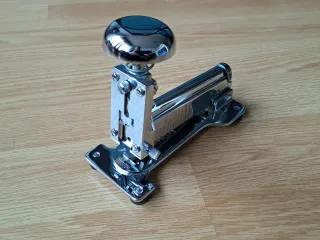 Grapadora profesional de sobremesa El Casco mod. M35. Diseño clásico, elegante y atemporal. Acabado brillo. Fabricada en España. Cuerpo de acero pulido a mano y bañado en níquel, cromo y cobre. Incorpora tornillo antiatasco y yunque giratorio que permite realizar tres tipos de grapado. Capacidad de carga 100 grapas de 24/6, 26/6 o 27/6. En perfecto estado, tanto estético como de funcionamiento Entrego en Rivas Vaciamadrid o envío por wallapop material oficina escritorio papelería despacho original industrial objeto coleccionismo decoración antigüedades adorno retro vintage antiguo