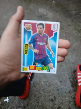 Cromo de colección de Lionel Messi del FC Barcelona. - Jugador: Messi - Equipo: FC Barcelona - Número de camiseta: 10 - Estadísticas: Ataque 90, Defensa 59, Control 239