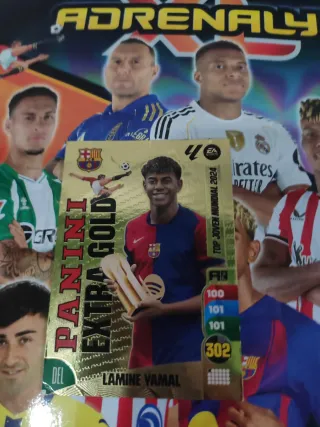 Colección de cromos Panini Adrenalyn XL de LaLiga. - Incluye cromos de jugadores como Lamine Yamal, Mbappé y Fede Valverde. - Cromos especiales como 'Extra Gold' y 'Balón de Oro'. - Incluye cromos de 'Campeón Card'.