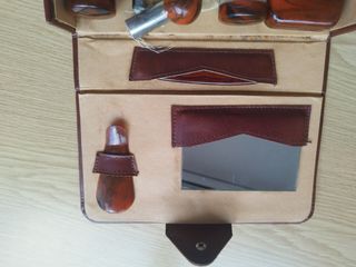 Si eres coleccionista, esta oferta es para ti. Este estuche de cuero marrón con más de 50 años de antigüedad continúa en estupendo estado de conservación. Contiene una botellita para masaje facial aftershave, maquinillas desmontables de Afeitar, cuchillas sin estrenar, calzador, peine, espejo, estuche para jabón de manos y otros accesorios. Si quieres más detalles, no dudes en preguntar sin ningún compromiso.