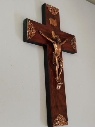crucifijo madera con laton, medidas alto cruz 40 cms, ancho cruz 23 cms, grosor madera 2 cms.