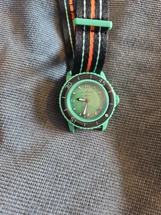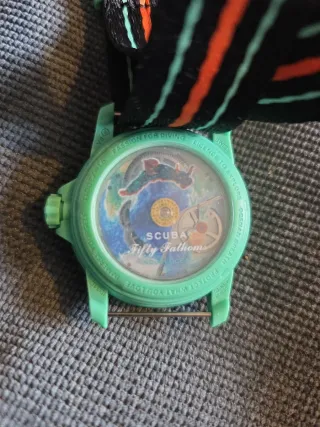 Reloj de buceo Scuba Fathoms en color verde. - Esfera verde. - Bisel giratorio negro. - Correa de tela con rayas negras, naranjas y verdes.No tiene caja.esfera de 44 mm