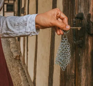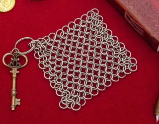 Llavero con un diseño de cadena de metal. Es un accesorio llamativo y resistente. - Material: Metal. - Diseño: Cadena entrelazada. Llavero y Fregador de acero inoxidable Chainmail: ideal para limpiar sartenes de hierro fundido, woks, ollas, planchas o calderos de hierro fundido. (No incluye llave). 300347-1