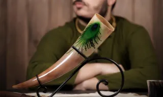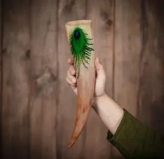 Vaso de estilo vikingo con una decoración única. - Hecho de cuerno natural. - Detalle pintado de pluma de pavo real. - Diseño cónico y alargado. 4258-3/5