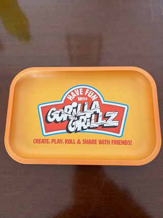 Bandeja de fumador Gorilla Grillz con un picador y cenicero. - Bandeja naranja con diseño. - Picador con diseño de gorila. - Cenicero con texto. - Texto: CREATE, PLAY, ROLL & SHAKE FRIENDS! - Texto: ONLY BUTTS HERE - Texto: IT WAS NICE WHILE IT LASTED